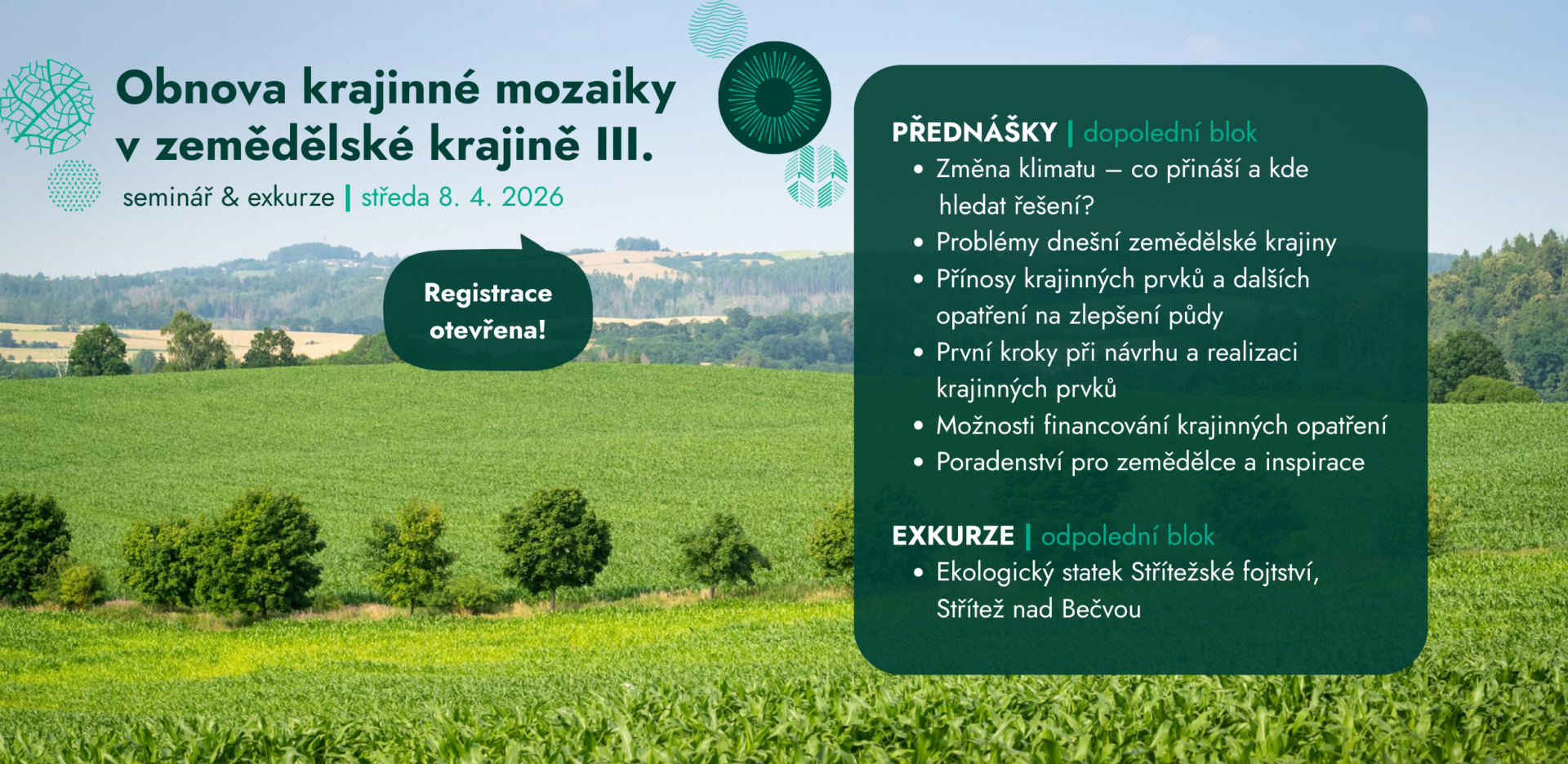 Zemědělská krajina čelí stále větším výzvám – sucho, eroze, nebo přívalové srážky. Na jednodenním semináři se dozvíte, jak tyto jevy prakticky řešit pomocí krajinných prvků. Chybět nebudou ani cenné informace týkající se zdraví půdy a možností jeho zlepšení. Součástí programu je i exkurze na ekologickou farmu, kde krajinné prvky vznikají a fungují už řadu let.