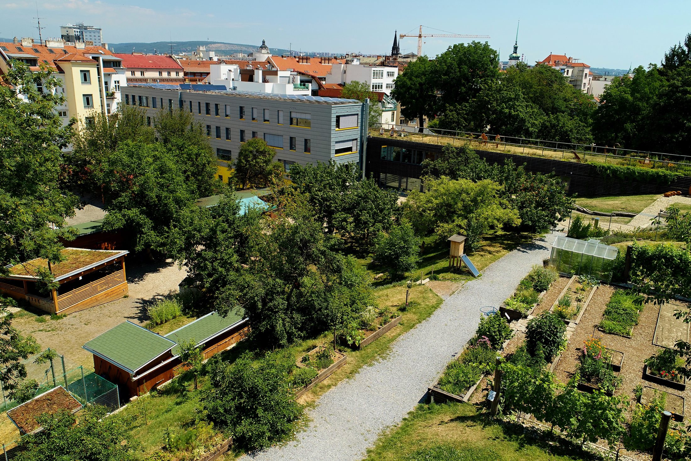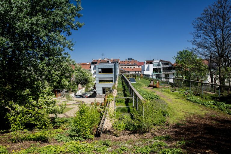 Využití dešťové vody Na střeše budovy B se kromě fotovoltaiky nachází i solární panely, které spolu s tepelnými čerpadly zajišťují ohřev vody. Vodu pro splachování a pro zavlažování zahrady v budově C získávají v areálu z drenážního systému a z dešťové nádrže. Využitím dešťovky v budovách šetří zhruba 60 procent spotřeby pitné vody ročně. Všechny vodovodní kohoutky jsou vybaveny šetřiči vody, které při napouštění mísí vodu se vzduchovými bublinami. Šedá voda z umyvadel putuje do horizontální kořenové čistírny odpadních vod, která je tvořena kačírkem a osázená vlhkomilnými trvalkami. V areálu se v současné době měří retenční kapacita intenzivní vegetační střechy na budově C (30 centimetrů substrátu) a dvou extenzivních lehkých zelených střech na zahradních přístřešcích, které využívají rozchodníkové koberce SedumTop na podkladu z minerální vaty nebo recyklátu firmy Retex. Získaná data ověřují velký potenciál vegetačních střech pro zadržování přívalových srážek i ochlazování městského mikroklimatu. Sledování teplot v půdě na zelené střeše budovy C navíc potvrzuje pozitivní vliv vegetačního souvrství na teplotní stabilizaci budovy a jejího okolí.