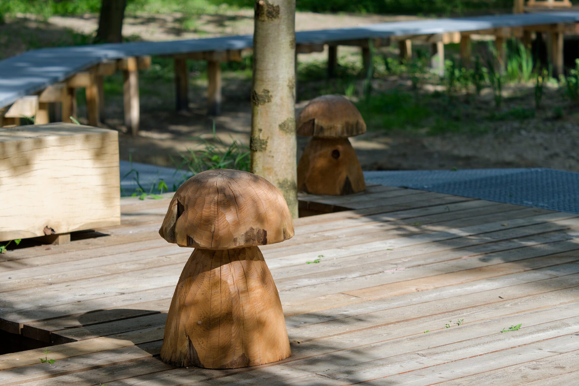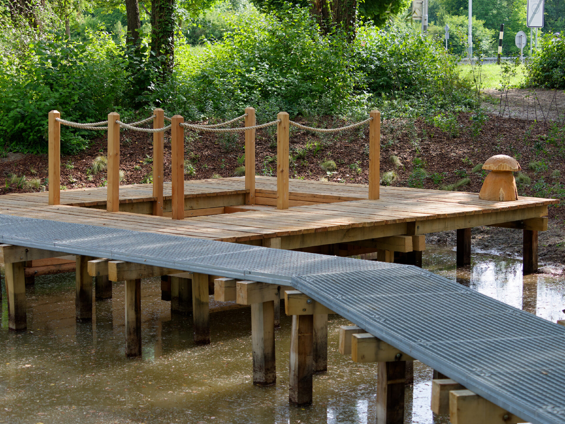 Území je doplněno novou sítí stezek, které jsou situována 30 cm nad terénem. Stezky jsou zhotoveny z pororoštů, které by časem měly splynout s přírodou. Stezky doplňují povalové chodníky a dřevěná mola, herní prvky a lavičky. Kolem povalových chodníků jsou umístěny edukační prvky, dřevěné cedule s obrázky fauny i flóry s popisky a jmenovkami jednotlivých druhů. Nechybí ani vodní hrátky.