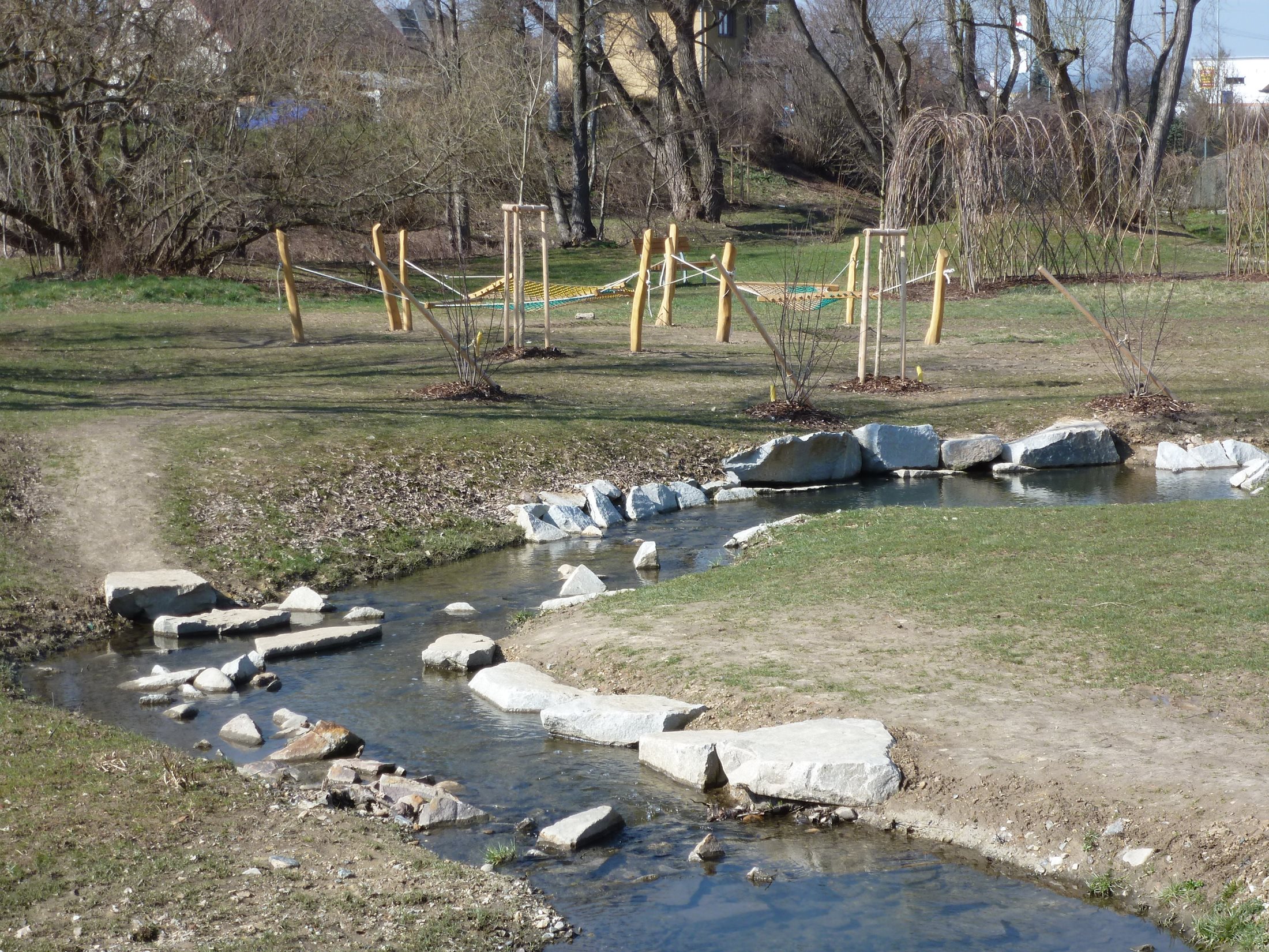 Součástí parkových prvků jsou i přechody přes vodní tok jako dřevěná plata a lanový mostek, které propojují levý a pravý břeh parku. U jednoho z hlavních vstupů do parku vznikl terénní model suchého koryta potoka s průtočnou tůní, která slouží jako pískoviště. Nezaplavované části parku doplňují další odpočinkové a herní prvky. A myslelo se i na zábavu v zimě. V jižní části parku je vytvořený svah pro sáňkování a bobování. O navazující etapě Znovuoživení Rakovského potoka v Rokycanech si můžete také přečíst v naší databázi.