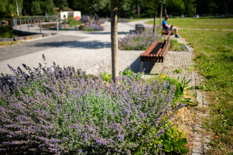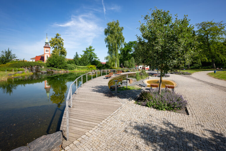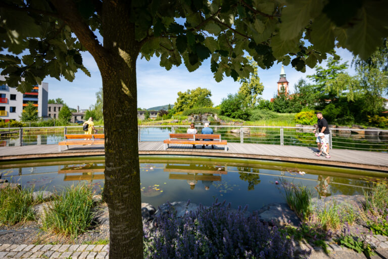 Zarostlé letní kino se proměnilo v živé, zelené srdce města. V Novém Jičíně vznikla příjemná relaxační zóna s jezírkem, květinovými záhony a místem pro setkávání lidí všech generací. Návštěvníci tu najdou lavičky ve stínu stromů, upravené chodníky, mobilní kavárnu, prostor pro menší kulturní akce i tiché posezení u vody. Nově vysazená zeleň a vodní plocha pomáhají zmírňovat přehřívání města, zlepšují mikroklima a zadržují vodu v území. Město zapojilo do návrhu i obyvatele, takže výsledný prostor skutečně odpovídá jejich představám – a rychle si získal oblibu místních i návštěvníků.
