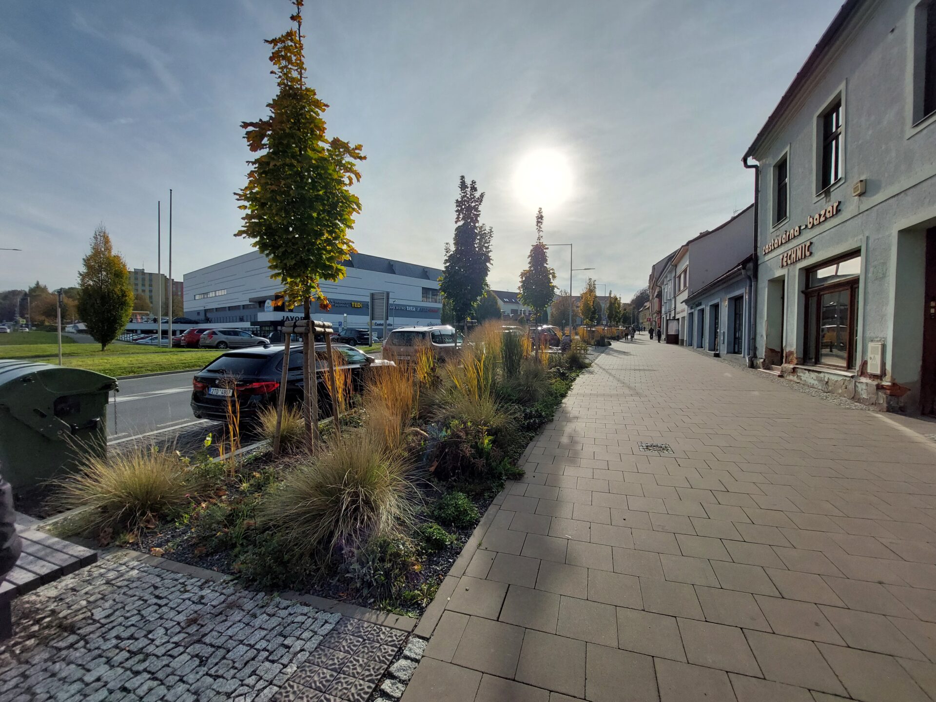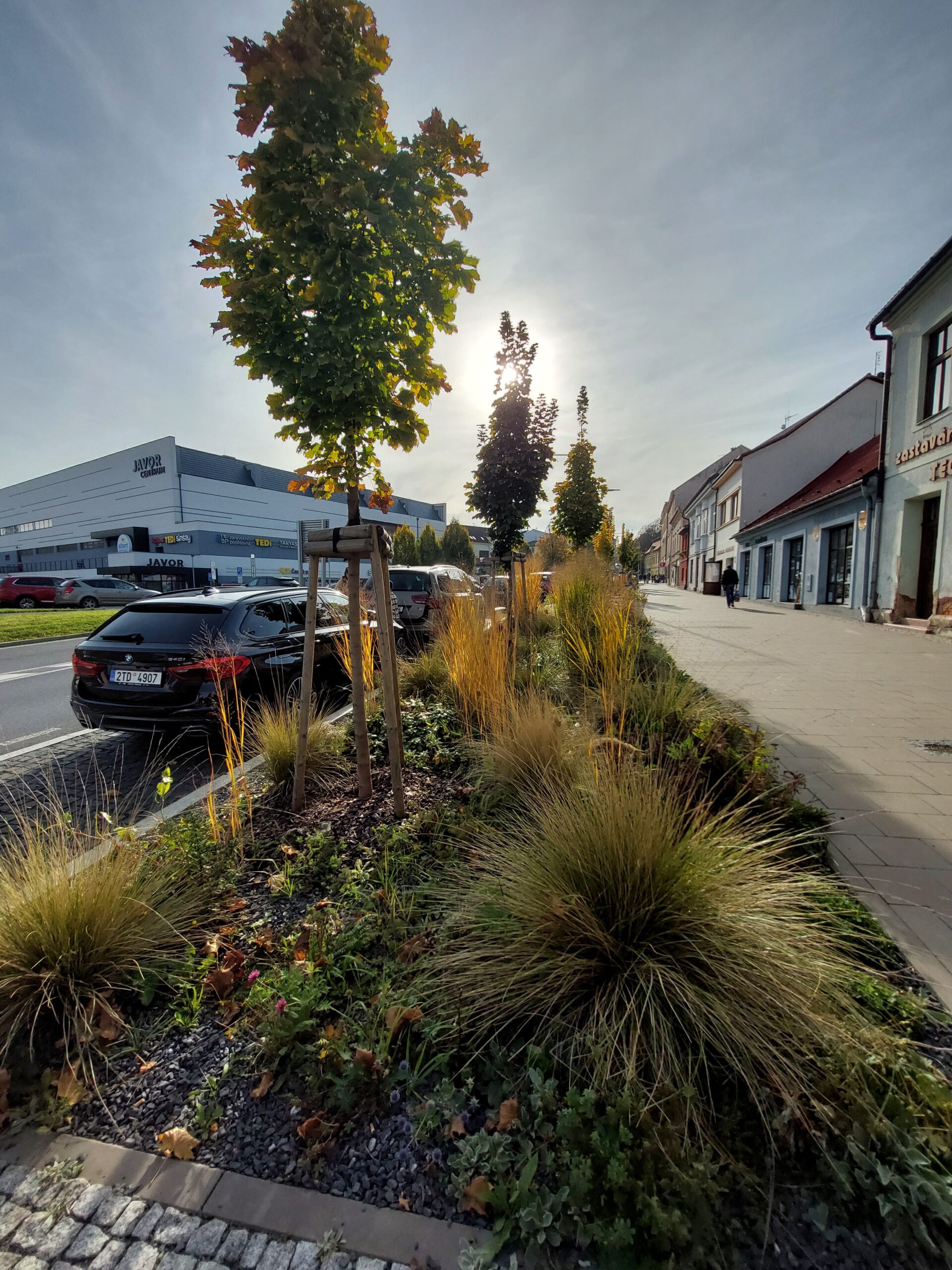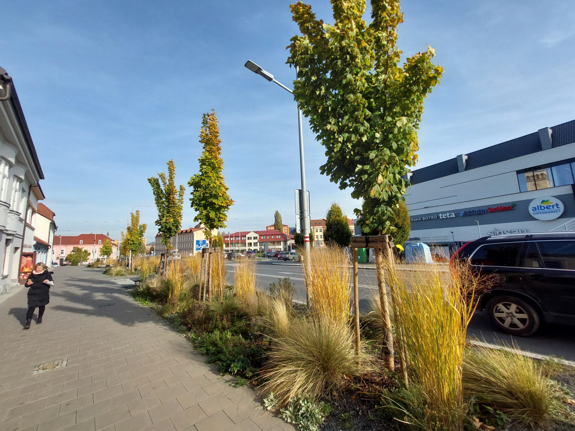 Na místě frekventované ulice vyrostly štěrkové trvalkové záhony s 10 kusy stromů – javorů. Vznikl zde nový kruhový objezd, nové chodníky s vodo propustnými povrchy.