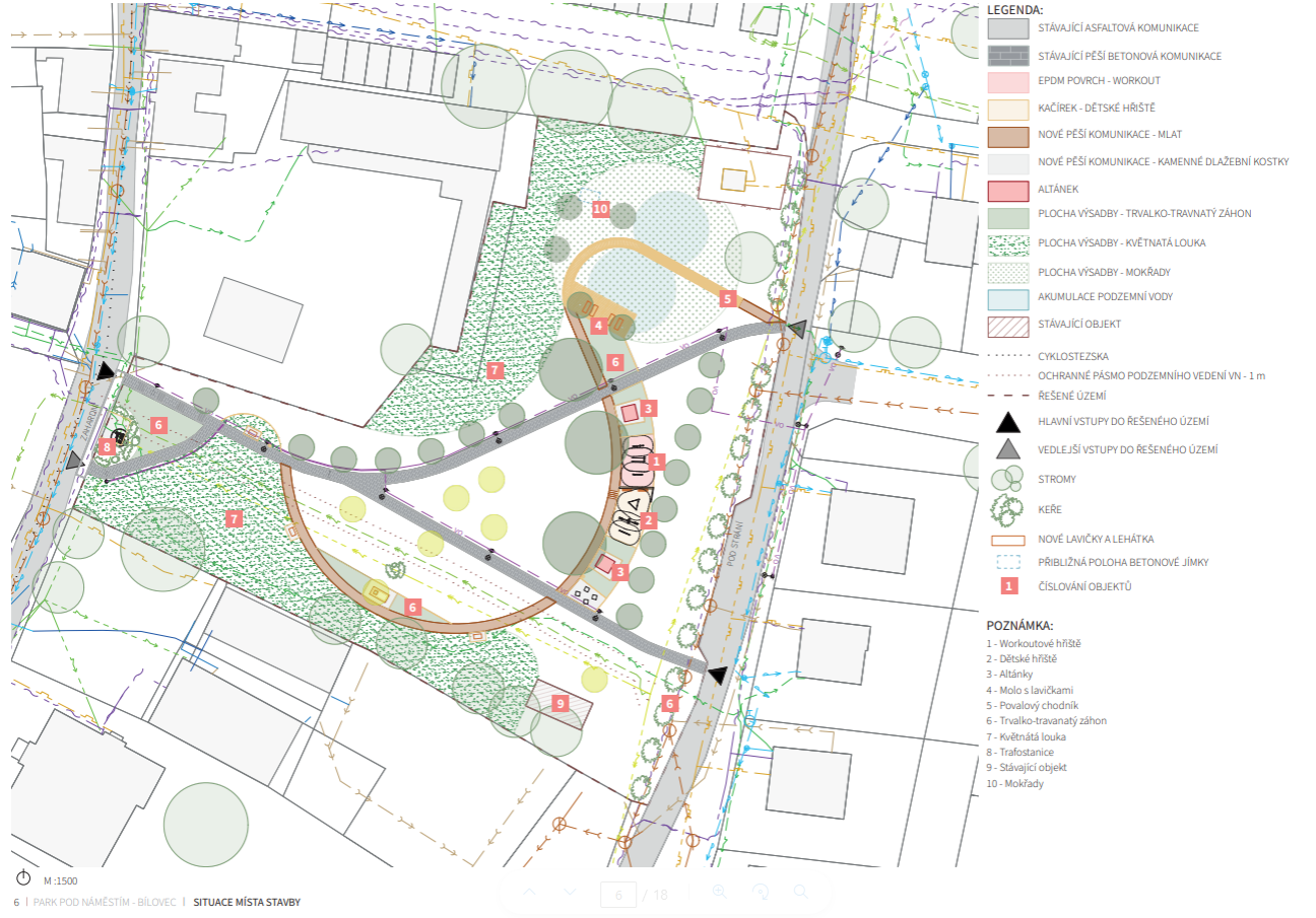 V současnosti je území tvořeno především zatravněnou plochou, kterou protíná betonový chodník s jednoduchým mobiliářem. Město má záměr vytvořit reprezentativní park sloužící veřejnosti všech věkových skupin. Park má zároveň nabídnout jednoduché možnosti trávení volného času. Důraz je kladen na minimalistické řešení a soulad s již existující architektonickou studií parku Střelnice. Požadováno je zachování stávajícího betonového chodníku. Návrh také počítá s doplněním zeleně, která opticky oddělí park od obytné zástavby na východní straně. Řešené území o ploše 6 398 m² se nachází pod náměstím v Bílovci a zahrnuje několik konkrétních parcel v katastrálním území Bílovec-město.Specifickým prvkem území je podzemní pramen v severní části, který způsobuje podmáčení půdy. Urbanisticky má park velký potenciál díky blízkosti náměstí a nedostatku obdobných ploch v okolí. Stávající chodník rozděluje území na tři části s odlišným využitím. Návrh tyto části propojuje okružním mlatovým chodníkem. Jižní část je navržena jako klidová zóna s lavičkami kvůli omezením daným inženýrskými sítěmi. Střední část tvoří hlavní pobytový prostor s altány, herními prvky a workoutem. Tento prostor je rozdělen opěrnou zídkou na klidovou a aktivní zónu. Doplněn je také o posedové prvky a konzolové lavičky. Severní část reaguje na přítomnost pramene dřevěným molem a pobytovou platformou. Materiálově je park řešen kombinací mlatových cest, kamenné dlažby, přírodního kameniva a EPDM povrchů. Konstrukce mola je navržena jako dřevěná nad terénem a opěrná zídka z pohledového betonu. Vegetační úpravy zahrnují výsadbu stromů, keřů, květnatých luk a trvalkových záhonů. V severní části jsou navrženy mokřadní druhy a na východě alej s keřovým podrostem pro optické oddělení prostoru.