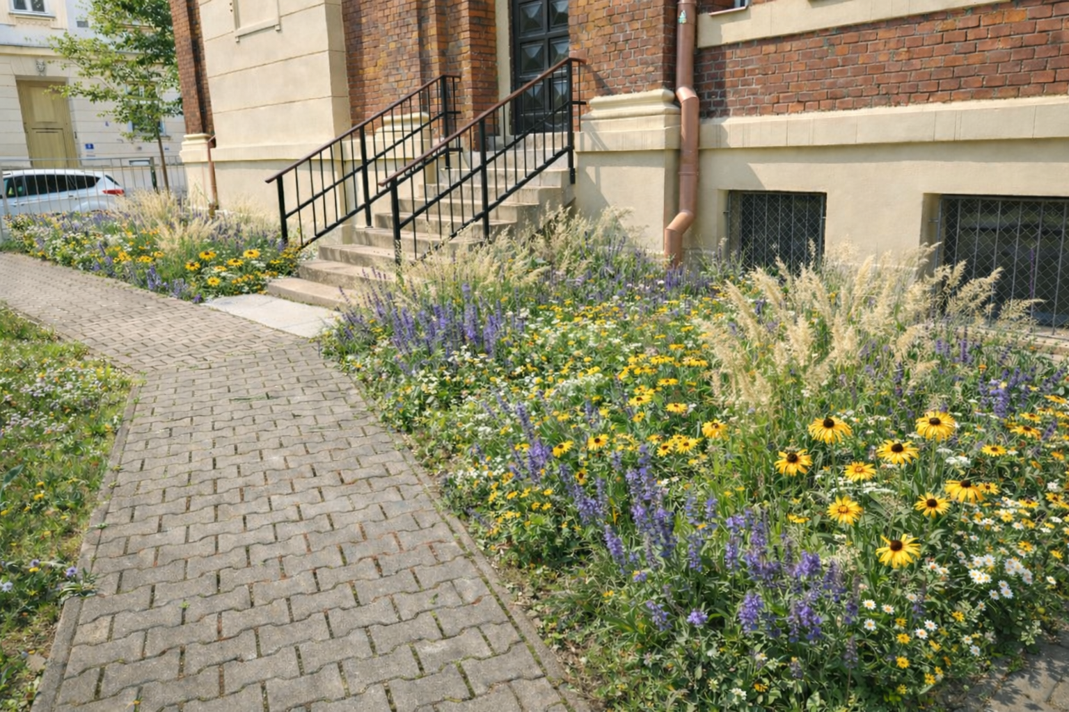 Důležitou roli hraje také hospodaření s dešťovou vodou, která bude zachytávána do podzemních nádrží a dále využívána. Technické zázemí, jako jsou kontejnerová stání, bude zakryto konstrukcemi s popínavými rostlinami. Nové trvalkové záhony budou navrženy tak, aby byly druhově pestré, dlouhodobě kvetly a nevyžadovaly náročnou údržbu. Do celého procesu návrhu i realizace budou aktivně zapojeni studenti, což podpoří jejich vztah k místu i rozvoj praktických dovedností.